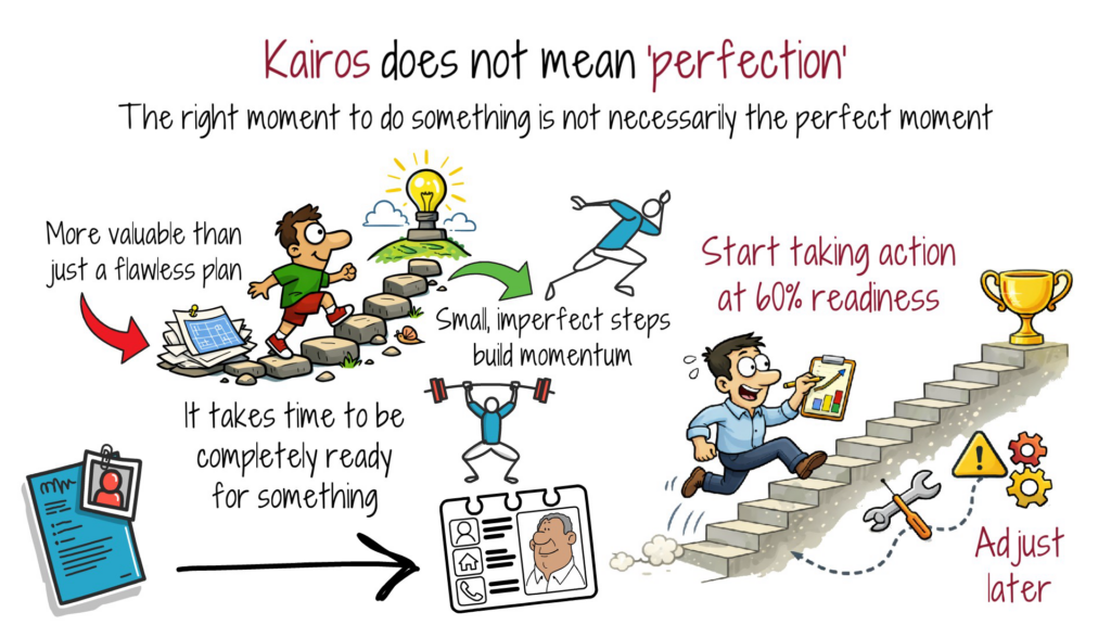 Don’t mistake Kairos with perfection, however. Just because it is the right moment to do something, that does not mean it’s perfect. Instead of waiting for that glittering moment, start taking action at 60% readiness and adjusting later. Put it this way, when you’re applying for a job, you may consider yourself the perfect candidate, but when you’re hired, are you the perfect employee? Maybe in attitude, but no. It takes time to be completely ready for something, and if you spend time waiting for you to reach that level before you do anything, well, you’ll be waiting for the rest of your life.