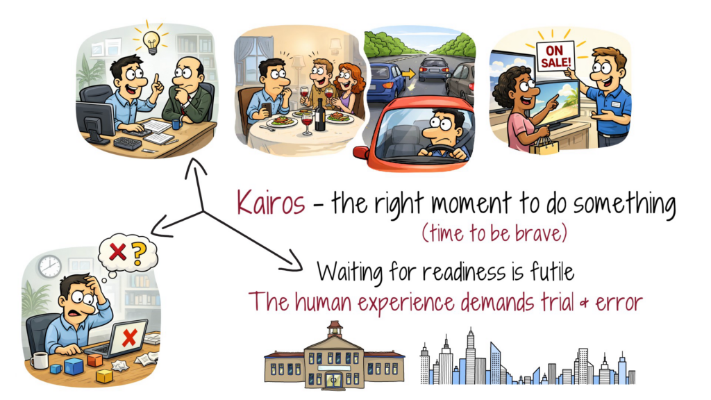 The ancient Greek word Kairos describes exactly the right moment to do something. It’s the realisation that it’s time to leave a dinner or the quick decision to go for a gap while driving. Essentially, it’s time to be brave. You exhibit Kairos every day, probably without realising.
