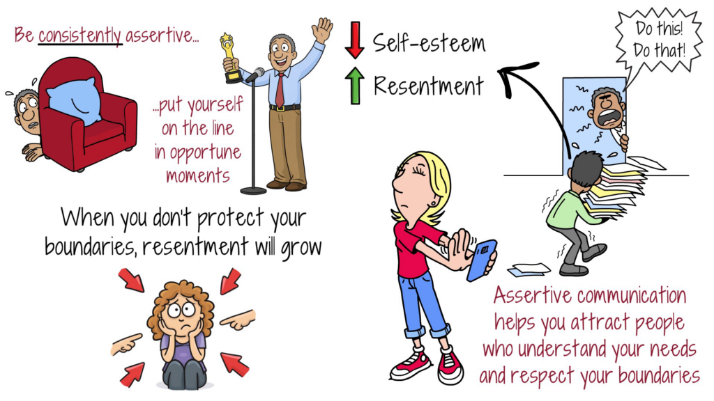 As a result, self-esteem can diminish and from there, resentment will have the conditions necessary to flourish. When you’re not leading with assertive communication, you’re essentially disrespecting yourself. Without taking active measures to prevent you from getting into scenarios you don’t want but could’ve avoided, you don’t have the secure knowledge that you’re taking care of yourself. Slowly and then all at once, that feeling of resentment will grow.